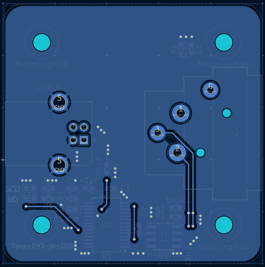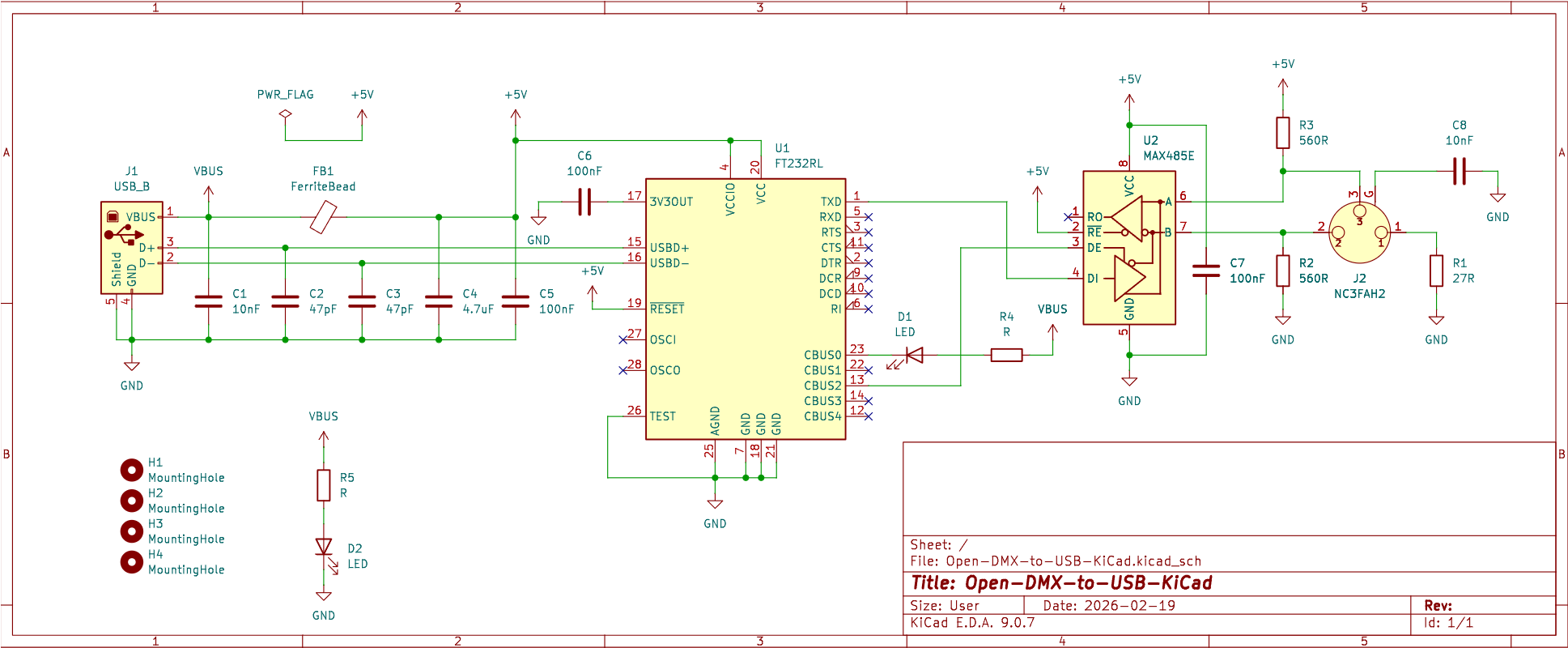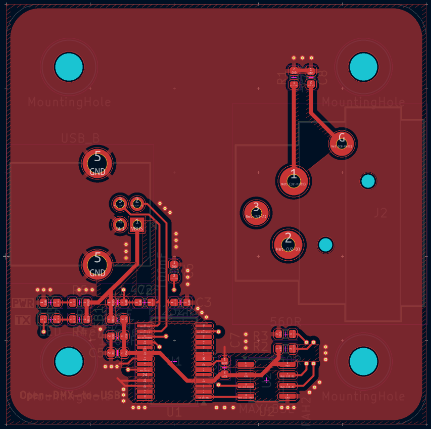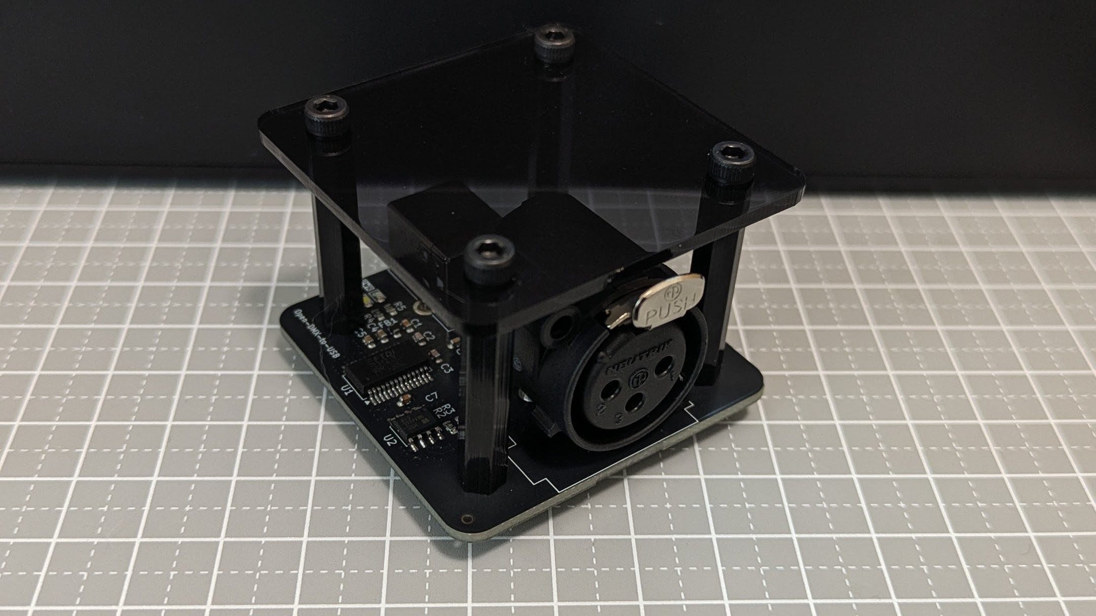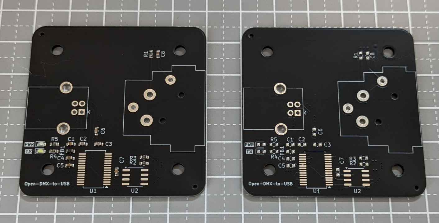 今回は FT232RNL と MAX485ED を基本とし、秋月の45基板用アクリルパネルに収まるような Open DMX USB を作成した。